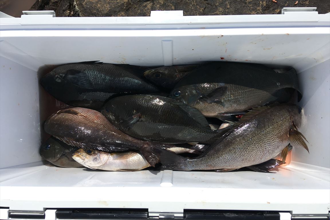 2023/04/30 倉島チョンボ再び 05/03/2023 01/05/2025 釣果 先月に続き倉島のチョンボに上がりました。やはり春になるとサイズ的に厳しく、クロとイサキがつれるものの殆どが30cm程度でした。夜はしばらくカゴで狙いましたがイサキ1匹のみ、諦めて底物に変更しましたがカサゴ小1匹と散々でした。ここはやはり夜の相性はわるいのかも? 夜に寝る時も上の段は風が当たり寝られず、下の岩陰で寝ました。隣の磯も同じ状況でしたが、夜グロ狙いで良いサイズが出たそうです。/