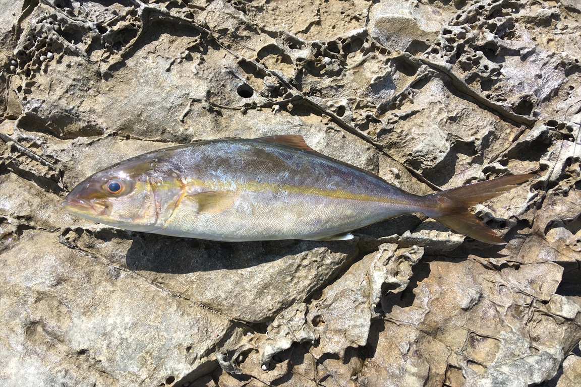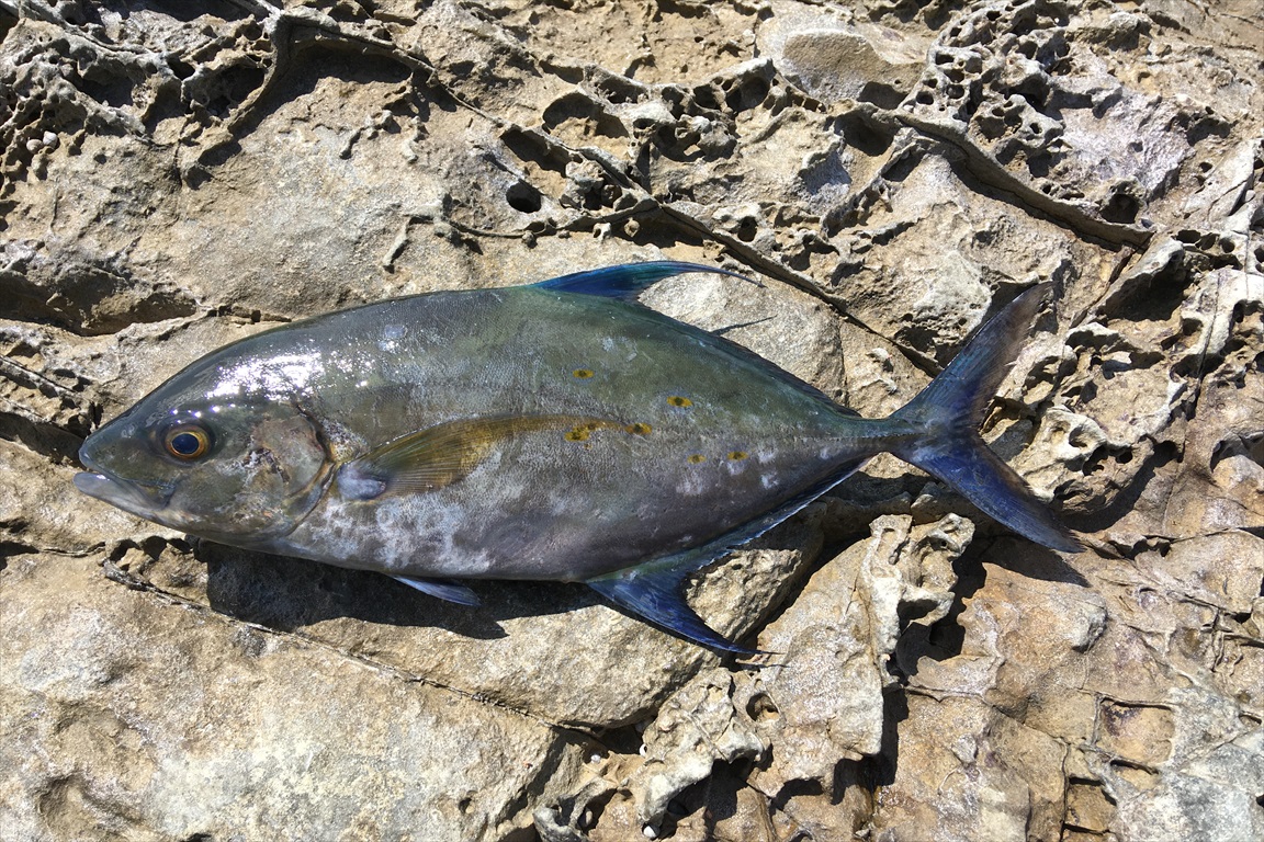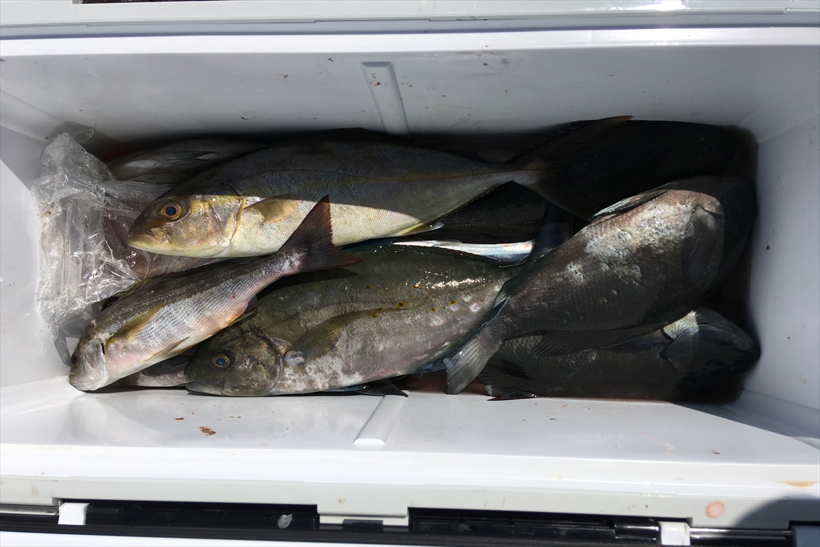久々の秋磯、ママコ地磯の湾横に上がれました。ここは過去ヒラマサも釣れていますので期待大です。釣り始めてすぐにナンヨウカイワリ、ヒラマサの子、クロ等が釣れ、非常に楽しめました。ただ、夜になると天気予報通りに風が強くなり、釣りになりませんでした。カゴでチビイサキが2匹釣れただけでした。早々と釣りはやめてビールと焼酎を楽しみました。翌朝は船長がママコの先端に瀬替わりさせてくれましたが、釣れるのは大きなイスズミとクロ小のみ。帰りの船は通常より2時間延長されて12時となり、辛い二日目でした。